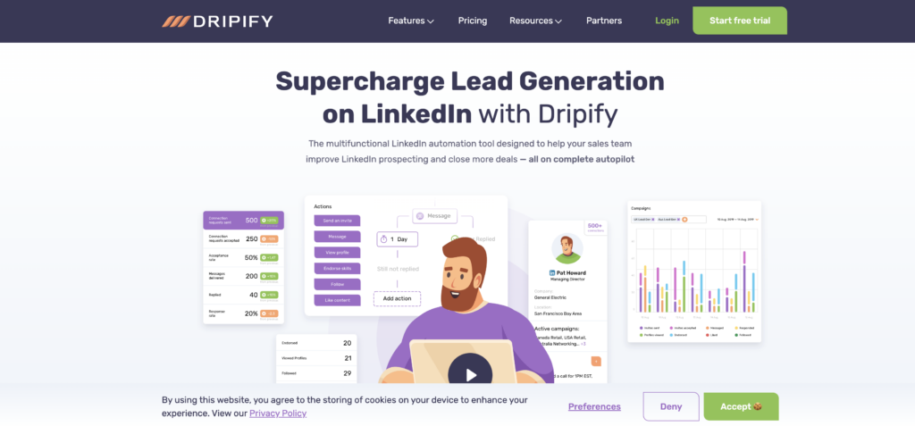 Dripify is a fully automated LinkedIn tool that casts a spell on your marketing efforts, effortlessly simulating your manual work while performing automated actions on your behalf. Sounds like magic, right? Well, it’s the closest you can get to it in the realm of digital marketing.