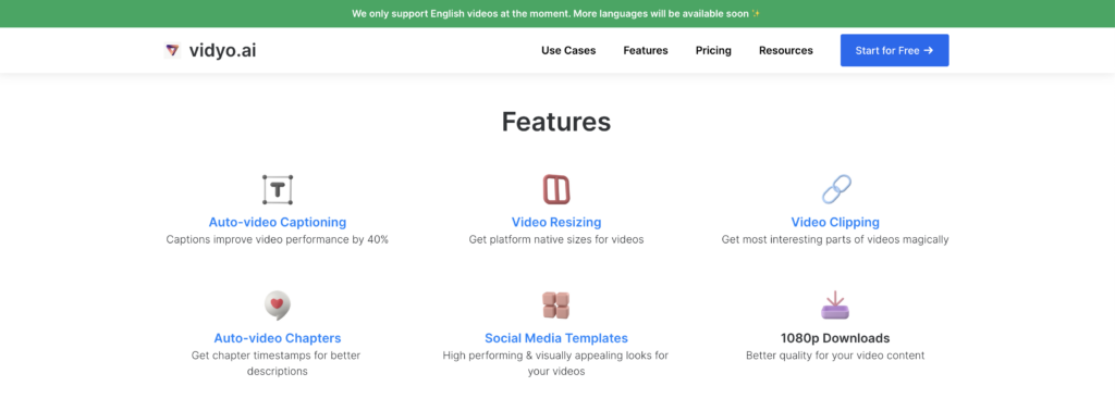 Vidyo.AI is a cutting-edge AI tool revolutionizing video content creation by intelligently selecting, editing, and captioning prime moments from your footage. Its features, including auto-video captioning that improves video performance by 40%, platform-native video resizing, and automatic video clipping, streamline the editing process. Vidyo.AI provides chapter timestamps for better content descriptions, offers visually appealing social media templates, and ensures superior video quality with 1080p downloads. With the capacity to create succinct, social-ready clips from longer videos, Vidyo.AI saves users up to 90% time and effort, making it a valuable asset for content creators and marketers alike.
