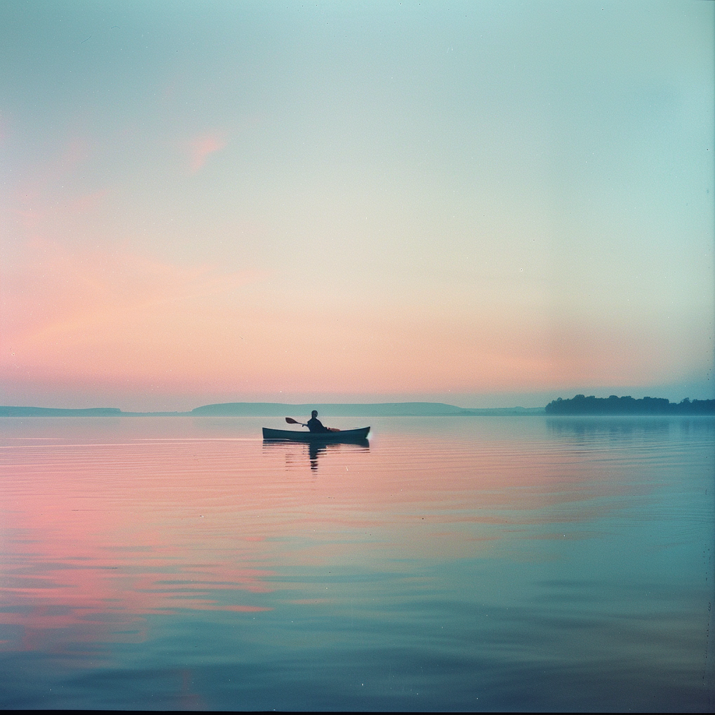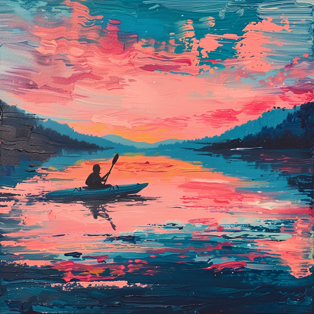 Example: breathtaking view of a serene lake at sunset with a kayaker paddling, teal and pink colors, photograph –s 200
